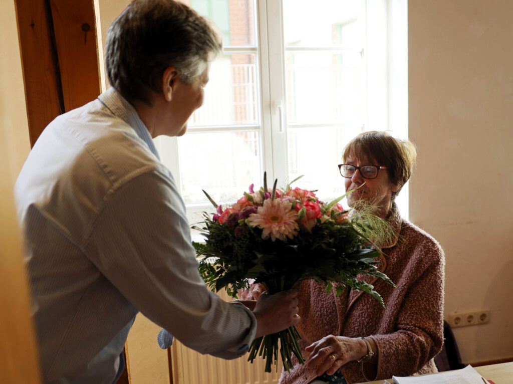 Mit einem dicken Blumenstrauß, überreicht von Alexandra Becker, dankte ihr der Verein für das Engagement, das weit über ein normales Maß an ehrenamtlicher Arbeit herausreichte. Hand in Hand mit Helga Wiciok wird sie auch künftig für die Alte Cuesterey da sein. Auch dafür dankt der Verein herzlich.