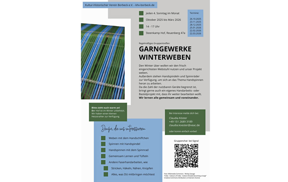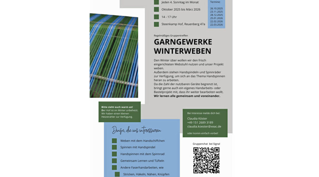 weben. Außerdem stehen Handspindeln und Spinnräder zur Verfügung, um sich an das Thema Handspinnen heranzuarbeiten. Da die Zahl der nutzbaren Geräte begrenzt ist, bringt gerne auch ein eigenes Handarbeits- oder Bastelprojekt mit, dass ihr weiter bearbeiten wollt. Wir lernen alle gemeinsam und voneinander.