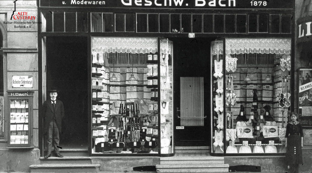 Stolz präsentieren sich die Geschwister Bach vor ihrem Geschäft für Kurz-, Weiß-, Woll- und Modewaren anno 1913. Ganz innovativ hatten sie 1912 ihr Geschäft modernisiert, d.h. die Schaufenster deutlich vergrößert. Das kann man im Vergleich zu dem wenig älteren Bild (unten) erkennen. Für die Jüngeren: Unter Kurzwaren versteht man Nähzubehör wir Knöpfe, Nadeln, Garn etc. – unter Weißwaren, das, was damals unbedingt aus weißem, kochfesten Material zu sein hatte: Unterwäsche. Wenn man etwas genauer hinschaut, glaubt man im rechten Schaufenster…