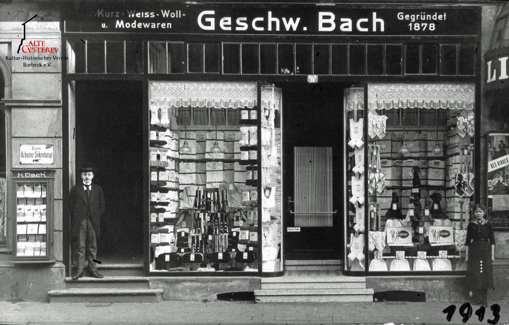 Stolz präsentieren sich die Geschwister Bach vor ihrem Geschäft für Kurz-, Weiß-, Woll- und Modewaren anno 1913. Ganz innovativ hatten sie 1912 ihr Geschäft modernisiert, d.h. die Schaufenster deutlich vergrößert. Das kann man im Vergleich zu dem wenig älteren Bild (unten) erkennen. Für die Jüngeren: Unter Kurzwaren versteht man Nähzubehör wir Knöpfe, Nadeln, Garn etc. – unter Weißwaren, das, was damals unbedingt aus weißem, kochfesten Material zu sein hatte: Unterwäsche.