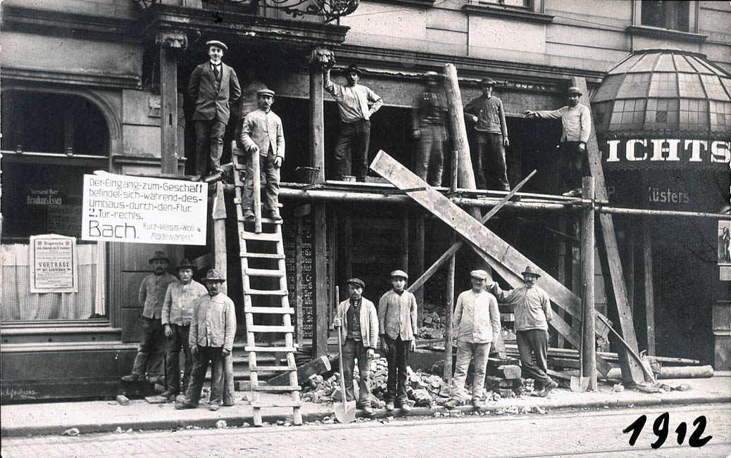 Das dritte Bild zeigt die Umbauarbeiten zum modernen Bach-Haus im Jahre 1912. Viele etwas ältere Borbeckerinnen und Borbecker werden sich noch an das Fachgeschäft erinnern. Bis in die Neunzigerjahre war es an der Ecke Marktstraße/Gerichtsstraße zu finden. Wer weiß es genau?