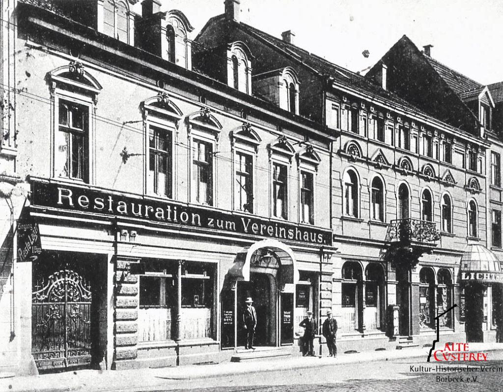 Auf dem mittleren Bild erkennt man das Bach’sche Geschäft zwischen dem Vereinshaus und dem Kino der Familie Küsters „Lichtspiele“. Die Häuserzeile lag an der Niederstraße, heute würde sie gegenüber dem neuen Markt zu finden sein.