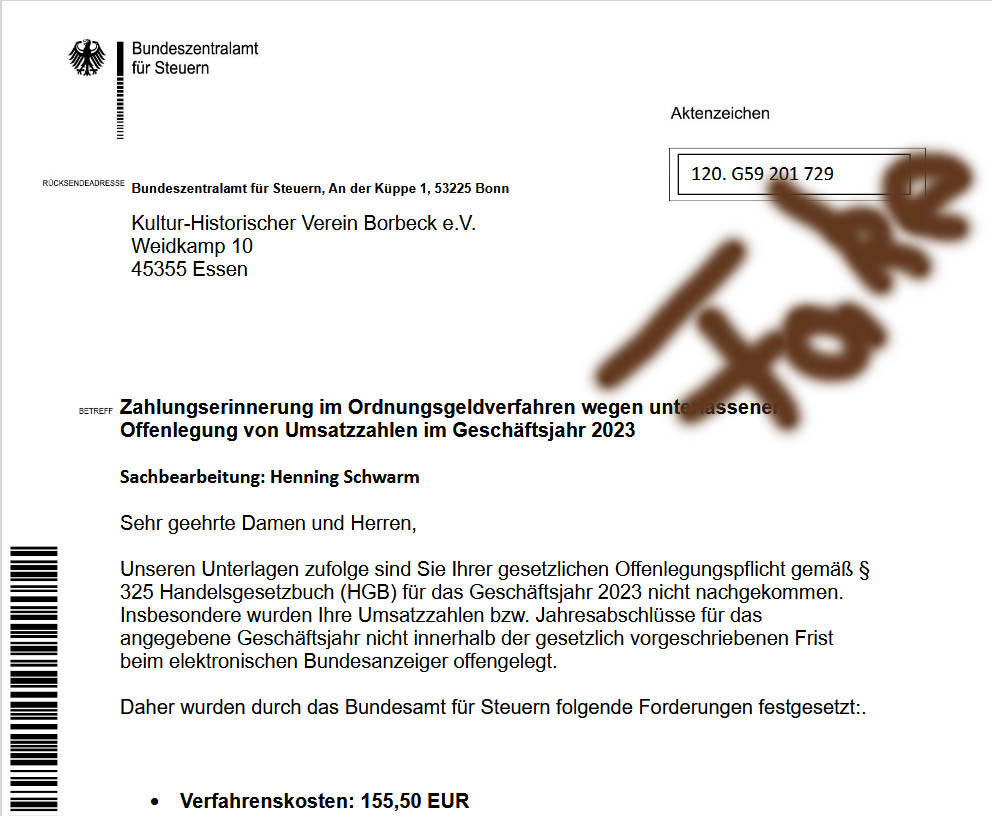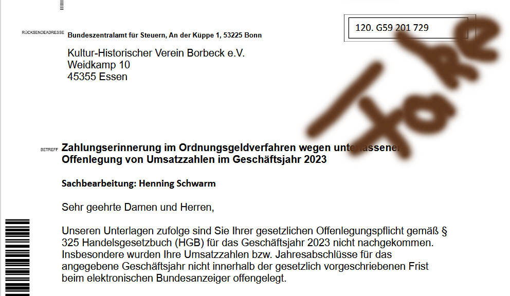 Das Schreiben sah sehr echt aus. Gefordert wurden vom Verein insgesamt 375 Euro, inklusive Ordnungsgeld und Mahngebühr. Der Grund sei eine „Unterlassene Offenlegung von Umsatzzahlen für das Jahr 2023“.