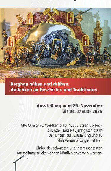 Liebe Mitglieder und Freunde des KHV, Wir freuen uns sehr, Ihnen die nächste große Weihnachtsausstellung des KHV anzukündigen! Es erwartet Sie eine faszinierende Schau vom 29. November 2025 bis zum 4. Januar 2026 in der „Alte Custerey“ in Essen-Borbeck. Im Fokus steht die beeindruckende Geschichte des Bergbaus, wobei wir die Traditionen des Ruhrgebiets mit denen des Erzgebirges in einen spannenden Kontext stellen. Diese besondere Ausstellung ist das Ergebnis einer großartigen Kooperation mit dem renommierten Bergbaukenner und Sammler Herbert Schielke aus…
