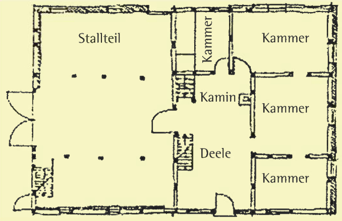Die Aufteilung des Hauses ist typisch für ein niedersächsisches Bauernhaus (Rechts im Bild Schematische Zeichnung des Grundrisses vom Steenkamp Hof). lm Stallteil waren die Kühe und Pferde untergebracht. Darüber, unter dem Dach, lagerten Heu und Stroh. Heute ist diese Bretterdecke entfernt. Man kann heute bis in den Dachstuhl schauen. Anschließend an den Stallteil war die Fleet mit dem Herd, daneben und darüber die Kammern für die Menschen. Die Bauersfrau am Herd konnte Wohn- und Stallteil überblicken. Der Brunnen zur Wasserversorgung existiert noch neben dem Gebäude.