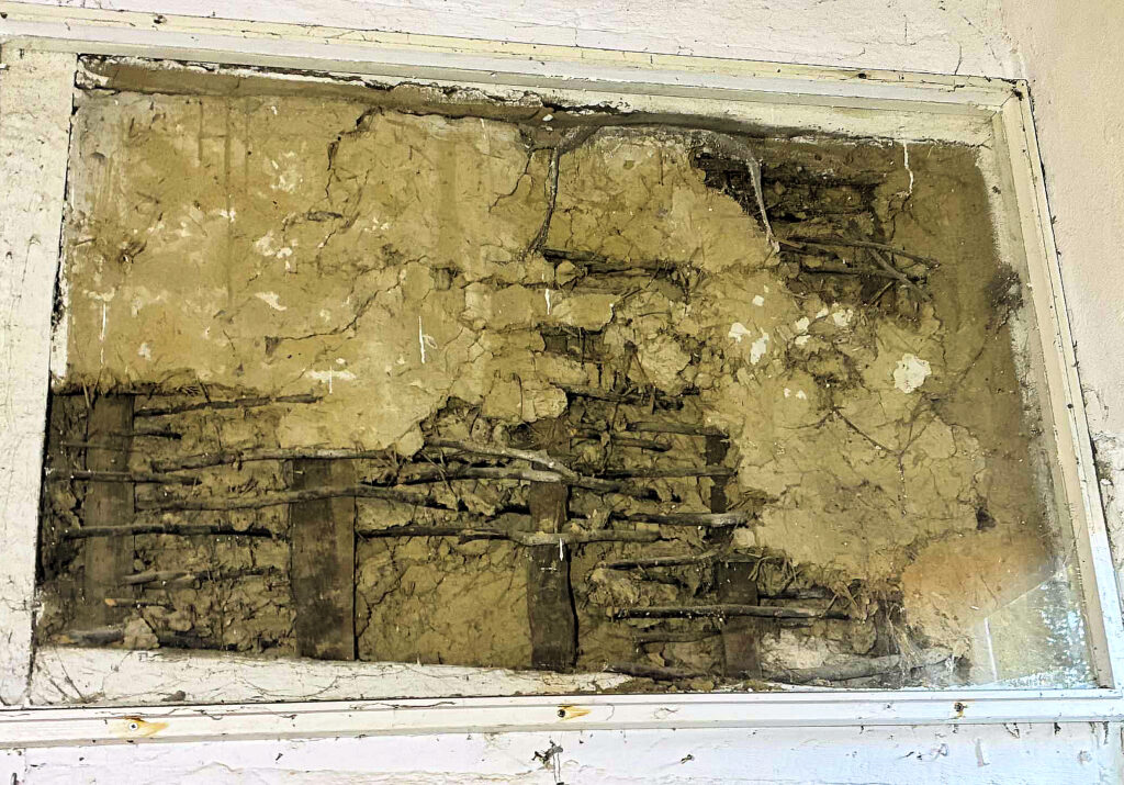 Die tragenden Balken des Gebäudes sind aus Eiche. Die Zwischenräume wurden zunächst mit Flechtwerk und mit Stroh gemischtem Lehm ausgefüllt, wie man in der Fleet an einer originalen Schaufläche im Hof (hier links im Bild) noch sehen kann. Später wurden die Zwischenräume, die Gefache, mit Ziegeln ausgemauert.